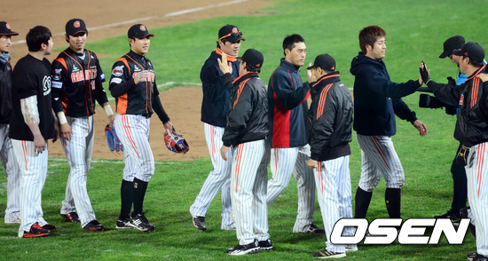 8일 오후 부산 사직야구장에서 열린 '마구매니저 아시아시리즈 2012' 롯데 자이언츠와 퍼스 히트의 경기 종료 후 롯데 선수들이 하이파이브를 하고 있다.
