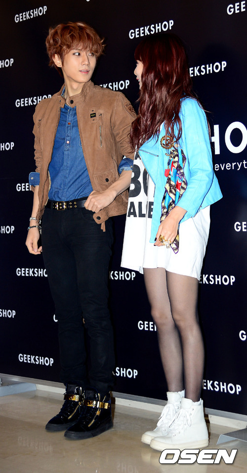 8일 오후 서울 영등포 타임스퀘어에서 진행된 '긱샵 GEEKSHOP-the cafe & evetyting' 오픈 파티에서 장현승과 현아가 포토타임을 갖던중 이야기를 나누고 있다.