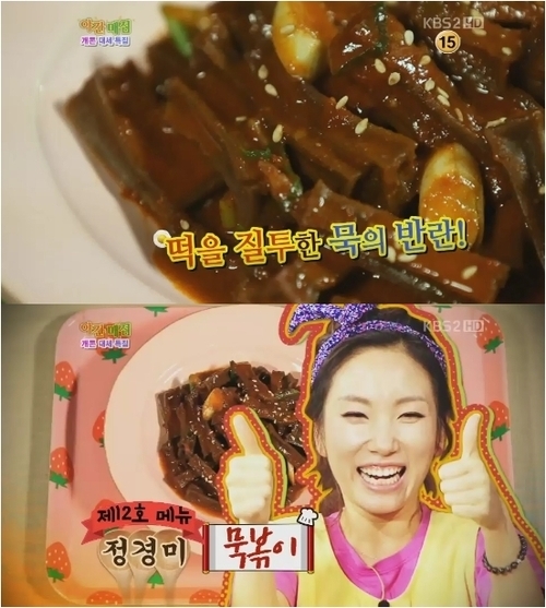정경미는 8일 방송된 KBS 2TV 예능 프로그램 ‘해피투게더3’ 인기코너 ‘야간매점’에서 묵으로 만든 묵볶이를 공개했다. 묵볶이는 말린 묵을 물에 불린 후 만든 것.