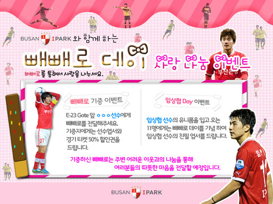 '부산 아이파크 사랑나눔 이벤트'로 명명된 이번 행사의 주인공은 빼빼로다. 11월 11일의 숫자 1이 빼빼로를 닮았다고 하여 많은 사람들이 사랑하는 사람들에게 빼빼로를 전하며 사랑을 확인하는 날이 된 '빼빼로DAY'에 부산 아이파크 역시 빼빼로를 통해 사랑을 전하기로 한 것.