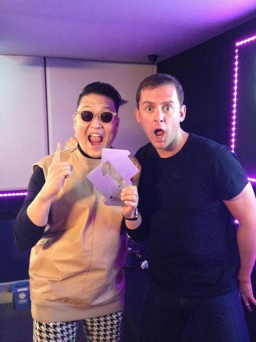 싸이는 9일(한국 시간) 자신의 트위터를 통해 "영국 오피셜 차트 1위 트로피를 받았다. 스캇 밀스와 함께"라는 글과 사진 한 장을 게재했다.