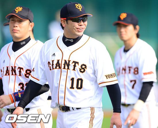 9일 오후 부산 사직구장에서 열린 '마구마구 매니저 아시아시리즈 2012' B조 예선 요미우리 자이언츠(일본)와 퍼스 히트(호주)의 경기에 앞서 요미우리 아베가 미소 짓고 있다