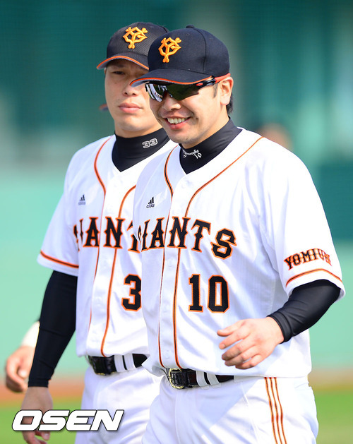 9일 오후 부산 사직구장에서 열린 '마구마구 매니저 아시아시리즈 2012' B조 예선 요미우리 자이언츠(일본)와 퍼스 히트(호주)의 경기에 앞서 요미우리 아베가 미소 짓고 있다