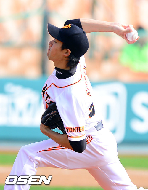 9일 오후 부산 사직구장에서 열린 '마구마구 매니저 아시아시리즈 2012' B조 예선 요미우리 자이언츠(일본)와 퍼스 히트(호주)의 경기 1회초 요미우리 선발투수 고야마가 역투하고 있다