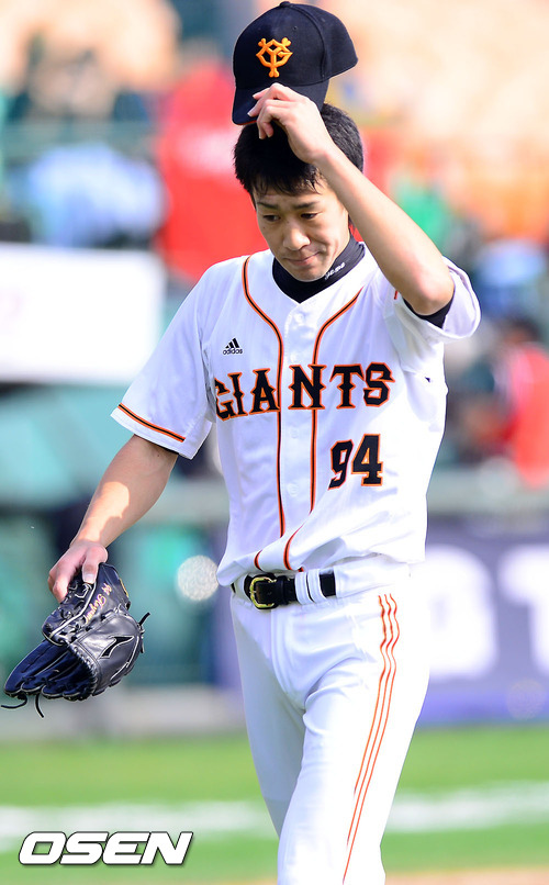 9일 오후 부산 사직구장에서 열린 '마구마구 매니저 아시아시리즈 2012' B조 예선 요미우리 자이언츠(일본)와 퍼스 히트(호주)의 경기 1회초 연속안타를 허용하며 위기를 맞앗던 요미우리 고야마 선발투수가 퍼스의 공격을 막은후 더그아웃으로 들어가고 있다.