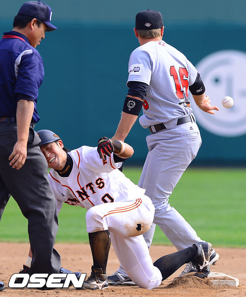 9일 오후 부산 사직구장에서 열린 '마구마구 매니저 아시아시리즈 2012' B조 예선 요미우리 자이언츠(일본)와 퍼스 히트(호주)의 경기 3회말 1사 1루 요미우리 가토의 타석때 1루 주자 후지무라가 퍼스 휴즈 2루수에게 태그아웃되고 있다.