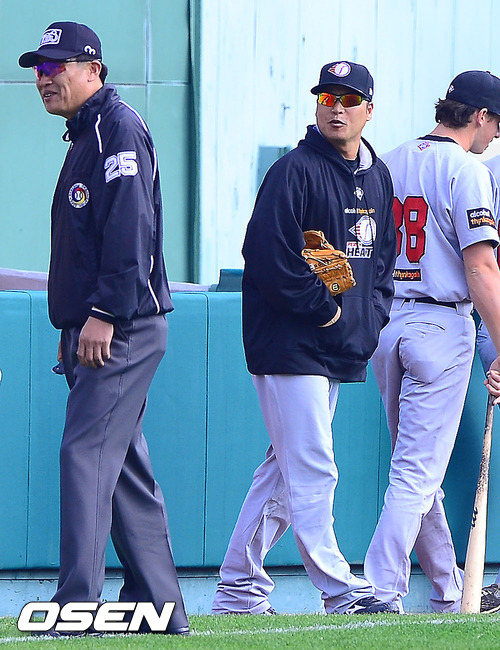 9일 오후 부산 사직구장에서 열린 '마구마구 매니저 아시아시리즈 2012' B조 예선 요미우리 자이언츠(일본)와 퍼스 히트(호주)의 경기 5회초 공수교대때 구대성이 박기택 3루심과 이야기를 나누고 있다
