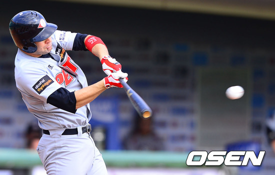 9일 오후 부산 사직구장에서 열린 '마구마구 매니저 아시아시리즈 2012' B조 예선 요미우리 자이언츠(일본)와 퍼스 히트(호주)의 경기 6회초 2사 2루 퍼스 케넬리가 선취 1타점 적시타를 날리고 있다