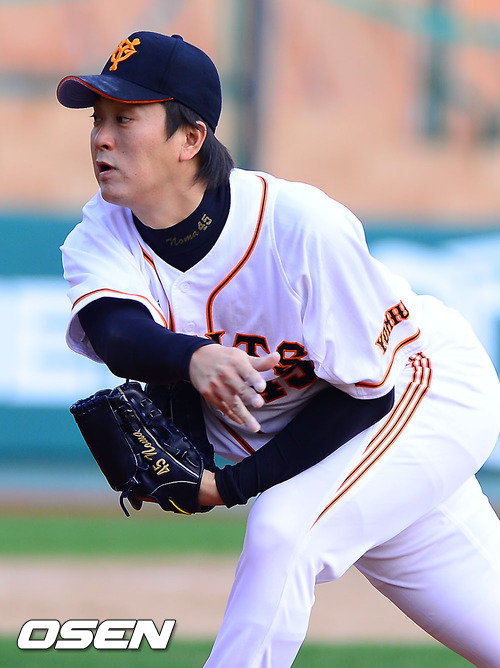 9일 오후 부산 사직구장에서 열린 '마구마구 매니저 아시아시리즈 2012' B조 예선 요미우리 자이언츠(일본)와 퍼스 히트(호주)의 경기 6회초 2사 2루 요미우리 노마구치 투수가 역투하고 있다.