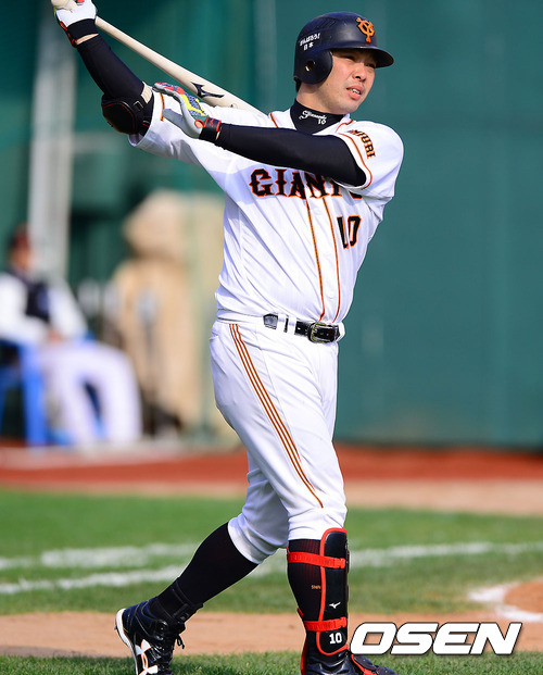 9일 오후 부산 사직구장에서 열린 '마구마구 매니저 아시아시리즈 2012' B조 예선 요미우리 자이언츠(일본)와 퍼스 히트(호주)의 경기 7회말 무사 1,3루 요미우리 아베가 가토와 교체돼 몸을 풀고 있다.