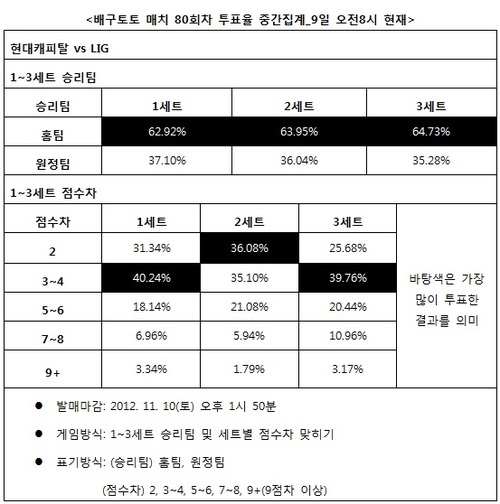 [배구토토] 국민체육진흥공단(www.kspo.or.kr)이 발행하는 체육진흥투표권 수탁사업자인 스포츠토토 공식 온라인 발매사이트 베트맨(www.betman.co.kr)이 10일 오후 2시 천안유관순체육관에서 열리는 2012-2013 V리그 현대캐피탈-LIG전 대상 배구토토 매치 80회차 게임 투표율을 중간집계한 결과, 국내 배구팬들은 현대캐피탈의 우세를 내다봤다고 전했다.