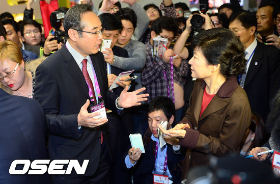 9일 오후 부산 해운대 벡스코(BEXCO)에서 열린 국제게임전시회 '지스타 2012'를 찾은 새누리당 박근혜 후보가 서태건 부산정보산업진흥원장과 이야기를 나누고 있다.