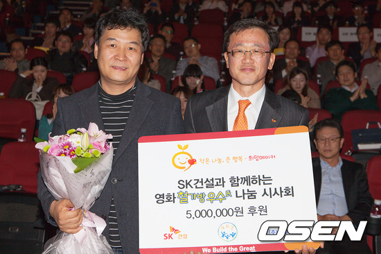 이날 극장에서 ‘철가방 우수씨’의 윤학렬 감독, 출연배우(이미지, 김정균, 권영찬, 장혜숙, 오지헌)와 SK건설 조기행 사장 및 임직원 300여명, 후원 아동들이 참석한 가운데 ‘철가방 우수씨’의 시사회와 기부금 전달식이 진행됐다