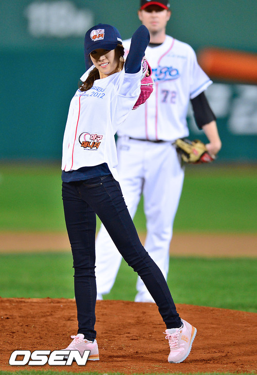 9일 부산 사직구장에서 열린 '마구매니저 아시아시리즈 2012' A조 예선 삼성 라이온즈(한국)와 라미고 몽키즈(대만)의 경기전 배지현 아나운서가 시구를 하고 있다.