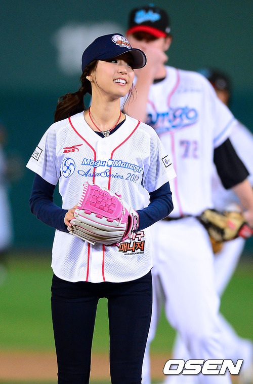 9일 부산 사직구장에서 열린 '마구매니저 아시아시리즈 2012' A조 예선 삼성 라이온즈(한국)와 라미고 몽키즈(대만)의 경기전 배지현 아나운서가 시구를 준비하고 있다