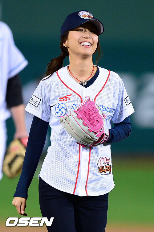 9일 부산 사직구장에서 열린 '마구매니저 아시아시리즈 2012' A조 예선 삼성 라이온즈(한국)와 라미고 몽키즈(대만)의 경기전 배지현 아나운서가 시구를마친 후 미소 짓고 있다.