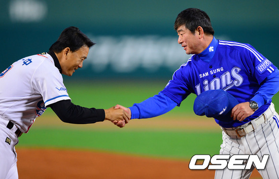 9일 부산 사직구장에서 열린 '마구매니저 아시아시리즈 2012' A조 예선 삼성 라이온즈(한국)와 라미고 몽키즈(대만)의 경기전 라미고 홍이종 감독과 삼성 류중일 감독이 악수를 나누고 있다