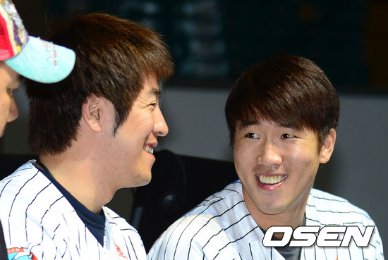 9일 부산 해운대 벡스코(BEXCO)에서 열린 국제게임전시회 '지스타 2012' 사인회에 참석한 롯데 전준우가 강민호와 이야기를 나누고 있다.