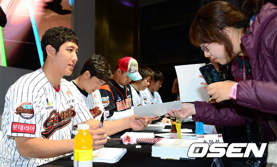 9일 부산 해운대 벡스코(BEXCO)에서 열린 국제게임전시회 '지스타 2012' 사인회에 참석한 롯데 황재균이 여성팬에게 사인을 건네고 있다.