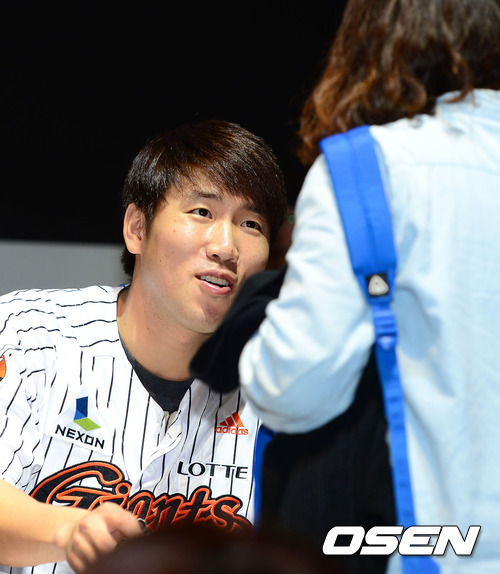 9일 부산 해운대 벡스코(BEXCO)에서 열린 국제게임전시회 '지스타 2012' 사인회에 참석한 롯데 전준우가 여성팬에게 사인을 해주고 있다.