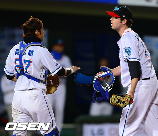 9일 부산 사직구장에서 열린 '마구매니저 아시아시리즈 2012' A조 예선 삼성 라이온즈(한국)와 라미고 몽키즈(대만)의 경기 3회초 2사 삼성 배영섭을 파울플라이 처리한 라미고 로리 선발투수가 후앙하오란 포수와하이파이브를 하고 있다