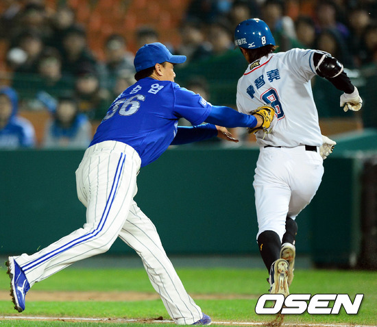 9일 오후 부산 사직구장에서 열린 '마구매니저 아시아시리즈 2012' A조 예선 삼성 라이온즈(한국)와 라미고 몽키즈(대만)의 경기 3회말 1사 1루 잔즈야오의 희생번트를 잡은 이승엽이 직접 태그아웃 시키고 있다.