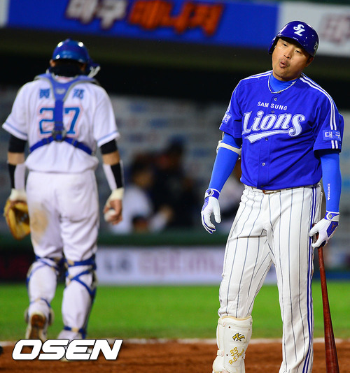 9일 부산 사직구장에서 열린 '마구매니저 아시아시리즈 2012' A조 예선 삼성 라이온즈(한국)와 라미고 몽키즈(대만)의 경기 3회초 2사 2루 삼성 박한이가 삼진아웃 당한 뒤 아쉬워하고 있다