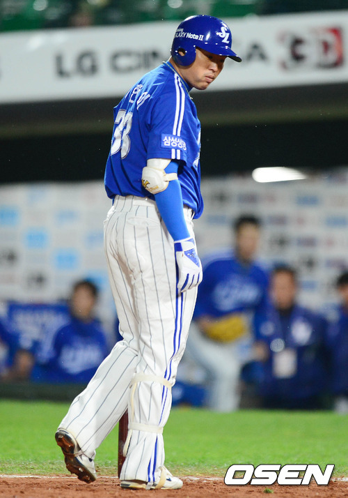 9일 오후 부산 사직구장에서 열린 '마구매니저 아시아시리즈 2012' A조 예선 삼성 라이온즈(한국)와 라미고 몽키즈(대만)의 경기 4회초 2사 2루 박한이가 삼진을 당한 후 덕아웃으로 향하고 있다.