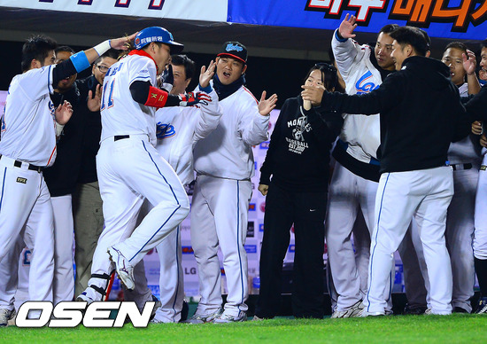 9일 부산 사직구장에서 열린 '마구매니저 아시아시리즈 2012' A조 예선 삼성 라이온즈(한국)와 라미고 몽키즈(대만)의 경기 4회말 라미고 선두타자 린홍위가 선취 솔로홈런을 날린후 동료들의 축하를 받고 있다