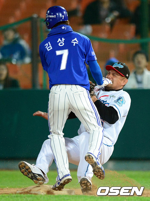 9일 오후 부산 사직구장에서 열린 '마구매니저 아시아시리즈 2012' A조 예선 삼성 라이온즈(한국)와 라미고 몽키즈(대만)의 경기 6회초 선두타자 김상수가 내야땅볼을 친 후 1루에서 스즈웨이와 충돌하고 있다.