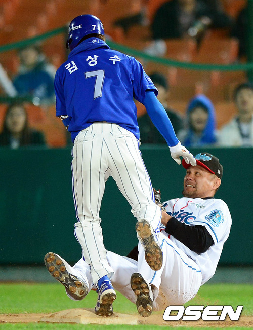 9일 오후 부산 사직구장에서 열린 '마구매니저 아시아시리즈 2012' A조 예선 삼성 라이온즈(한국)와 라미고 몽키즈(대만)의 경기 6회초 선두타자 김상수가 내야땅볼을 친 후 1루에서 스즈웨이와 충돌하고 있다.