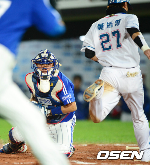 9일 오후 부산 사직구장에서 열린 '마구매니저 아시아시리즈 2012' A조 예선 삼성 라이온즈(한국)와 라미고 몽키즈(대만)의 경기 7회말 무사 2,3루 잔즈야오의 2타점 적시타 상황, 2루주자 후앙하오란이 홈에서 세이프되고 있다.