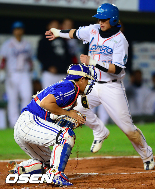9일 부산 사직구장에서 열린 '마구매니저 아시아시리즈 2012' A조 예선 삼성 라이온즈(한국)와 라미고 몽키즈(대만)의 경기 무사 2,3루 라미고 잔즈야오의 2타점 적시타때 삼성 이지영 포수가 공을 놓치며 2루 주자 득점을 허용하고 있다