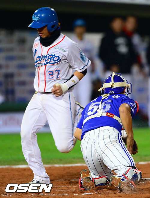 9일 부산 사직구장에서 열린 '마구매니저 아시아시리즈 2012' A조 예선 삼성 라이온즈(한국)와 라미고 몽키즈(대만)의 경기 무사 2,3루 라미고 잔즈야오의 2타점 적시타때 삼성 이지영 포수가 공을 놓치며 2루 주자 득점을 허용하고 있다