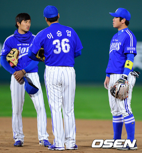 9일 부산 사직구장에서 열린 '마구매니저 아시아시리즈 2012' A조 예선 삼성 라이온즈(한국)와 라미고 몽키즈(대만)의 경기 7회말 무사 1루 라미고 후앙하오란의 번트때 실책을 범함 삼성 이승엽이 김상수 조동찬과 이야기를 나누고 있다. 1루 주자는 3루, 주자는 2루에 세이프됐다
