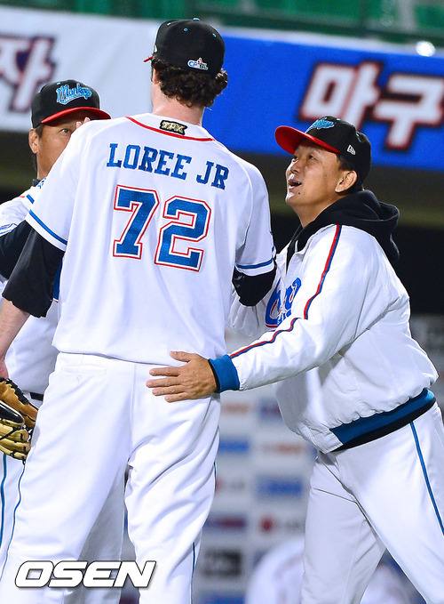 경기종료 후 라미고 홍이종 감독이 완봉승 거둔 로리를 격려하고 있다./ soul1014@osen.co.kr