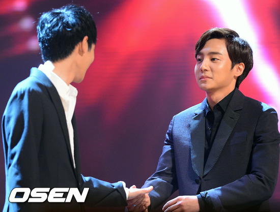 9일 저녁 서울 동대문구 경희대학교 평화의 전당에서 열린 Mnet ‘슈퍼스타K4’(이하 ‘슈스케4’) 다섯번째 생방송에서 로이킴이 TOP3에 진출하며 정준영과 악수를 나누고 있다.