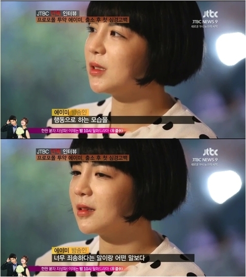 에이미는 지난 9일 방송된 종합편성채널 JTBC ‘연예특종’에서 “아직은 다른 사람들 눈을 못 쳐다보겠다”면서 “나쁜 것은 더 달콤하게 찾아오고 그만큼 빠져나오기도 힘든 것 같다. 정말 죄송하단 말을 하고 싶고, 어떤 말보다 행동하는 모습을 보여주고 싶다”고 고개를 숙였다.