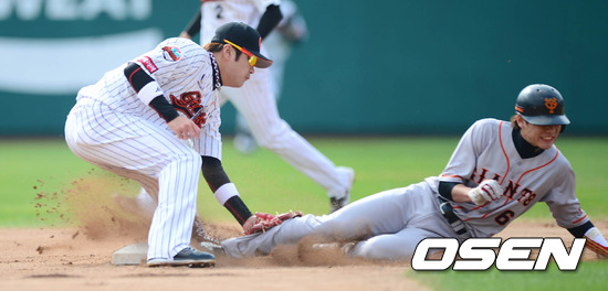 10일 오후 부산 사직구장에서 열린 '마구매니저 아시아시리즈 2012' B조 예선 롯데 자이언츠와 요미우리 자이언츠의 경기 1회초 2사 1루 아베의 타석, 사카모토가 도루에 성공하고 있다.