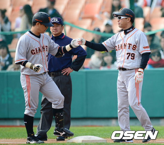 10일 오후 부산 사직구장에서 열린 '마구매니저 아시아시리즈 2012' B조 예선 롯데 자이언츠와 요미우리 자이언츠의 경기 1회초 2사 1,2루 무라타가 1타점 적시타를 치고 1루 코치와 하이파이브를 하고 있다.