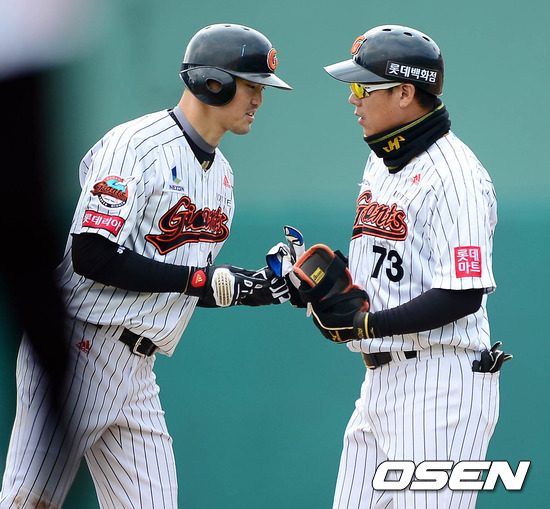 10일 오후 부산 사직구장에서 열린 '마구매니저 아시아시리즈 2012' B조 예선 롯데 자이언츠와 요미우리 자이언츠의 경기 2회말 1사 박종윤이 우익수 옆 2루타를 치고 박계원 코치에게 장비를 건내며 이야기를 나누고 있다.