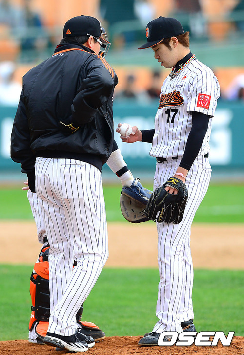 10일 오후 부산 사직구장에서 열린 '마구매니저 아시아시리즈 2012' B조 예선 롯데 자이언츠와 요미우리 자이언츠의 경기 3회초 무사 만루 위기에서 롯데 선발투수 고원준이 주형광 코치와 이야기를 나누고 있다.