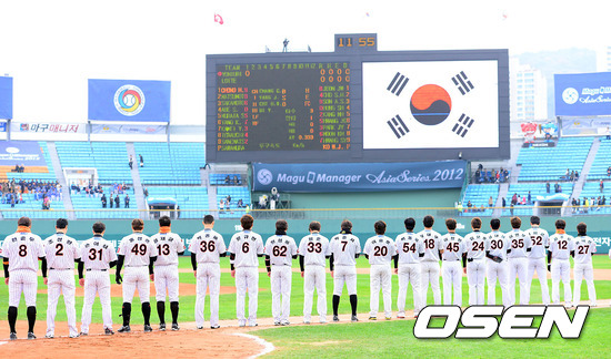 10일 오후 부산 사직구장에서 열린 '마구매니저 아시아시리즈 2012' B조 예선 롯데 자이언츠와 요미우리 자이언츠의 경기에 앞서 롯데 선수들이 국민의례를 하고 있다