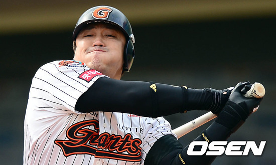 10일 오후 부산 사직구장에서 열린 '마구매니저 아시아시리즈 2012' B조 예선 롯데 자이언츠와 요미우리 자이언츠의 경기 5회말 2사 2루 홍성흔이 헛스윙을 하고 있다.