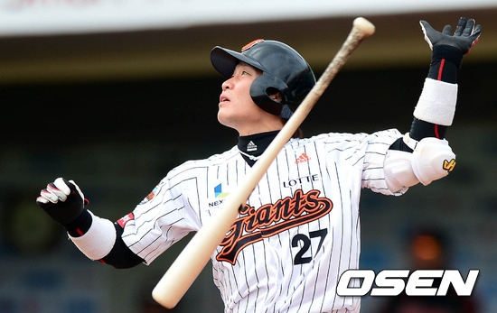 10일 오후 부산 사직구장에서 열린 '마구매니저 아시아시리즈 2012' B조 예선 롯데 자이언츠와 요미우리 자이언츠의 경기 5회말 2사 1,2루 용덕한이 뜬공을 치고 있다.
