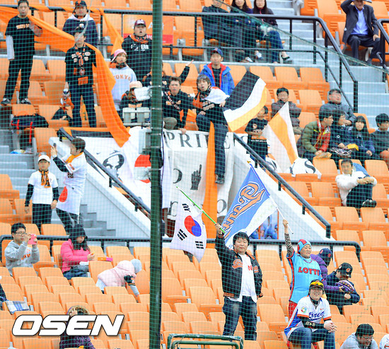 10일 오후 부산 사직구장에서 열린 '마구매니저 아시아시리즈 2012' B조 예선 롯데 자이언츠와 요미우리 자이언츠의 경기 한 야구팬들이 요미우리 응원단 앞에서 열띤 응원을 펼치고 있다