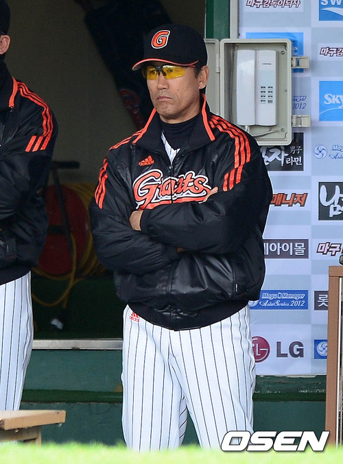 10일 오후 부산 사직구장에서 열린 '마구매니저 아시아시리즈 2012' B조 예선 롯데 자이언츠와 요미우리 자이언츠의 경기 7회초 권두조 감독대행이 경기를 바라보고 있다.