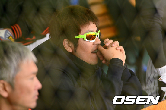 10일 오후 부산 사직구장에서 열린 '마구매니저 아시아시리즈 2012' B조 예선 롯데 자이언츠와 요미우리 자이언츠의 경기 통증으로 교체된 롯데 강민호가 더그아웃에서 경기를 지켜보고 있다.
