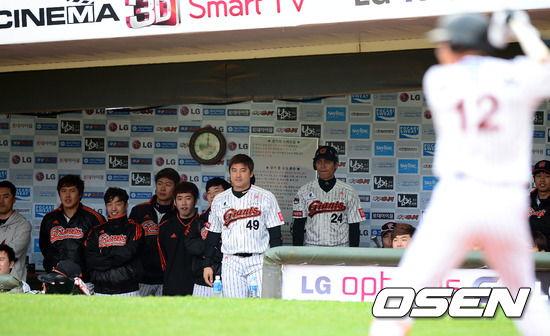 10일 오후 부산 사직구장에서 열린 '마구매니저 아시아시리즈 2012' B조 예선 롯데 자이언츠와 요미우리 자이언츠의 경기 9회말 1사 1루 대타 김주찬의 타석 선수들이 경기를 지켜보고 있다.