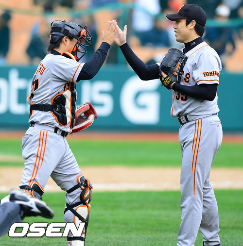5-0의 승리를 거둔 요미우리 니시무라 투수와 사네마츠 포수가 승리의 하이파이브를 하고 있다./soul1014@osen.co.kr